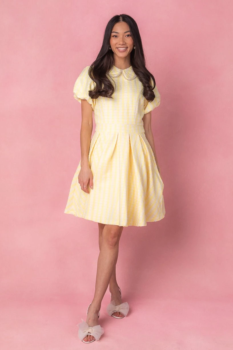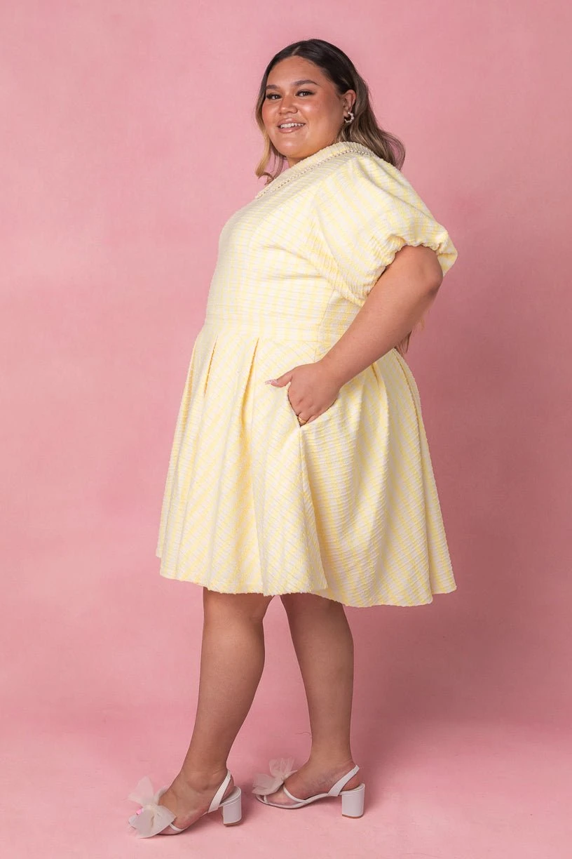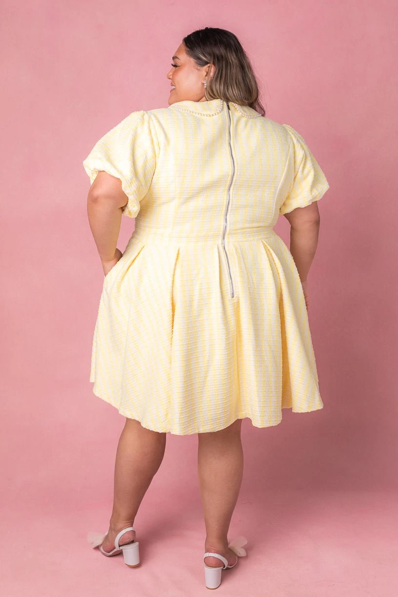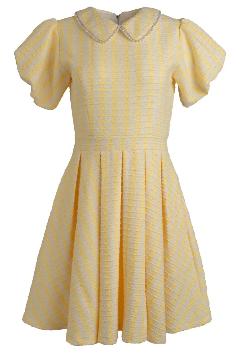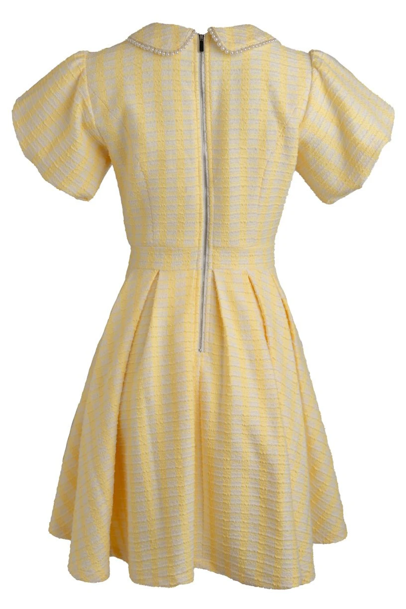 yellow and white tweed knee length dress