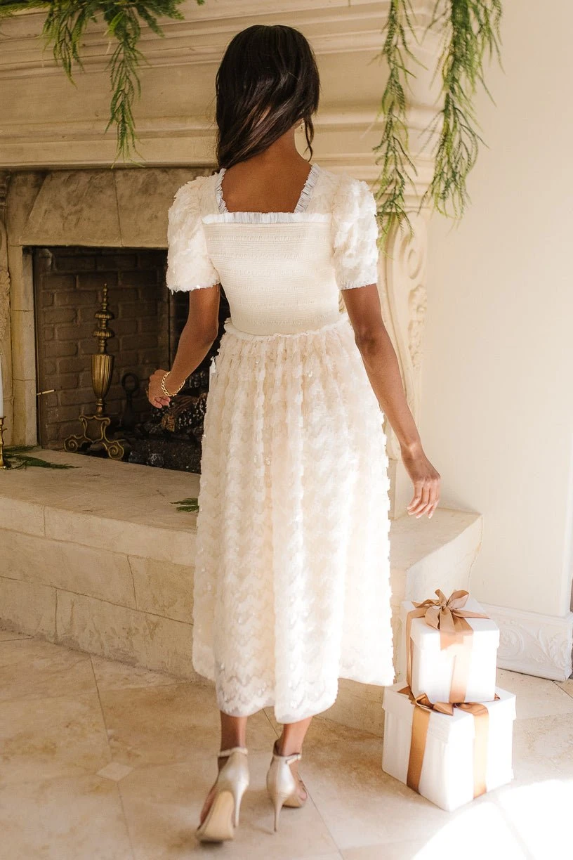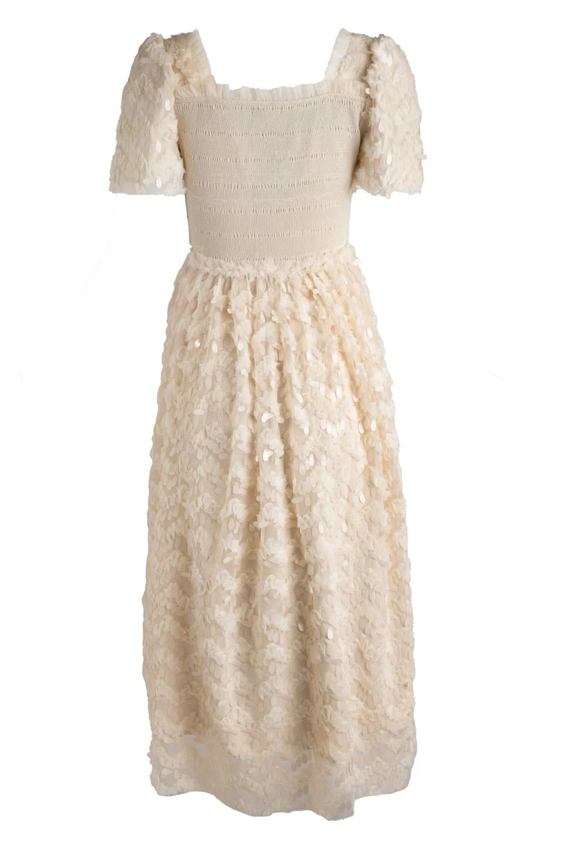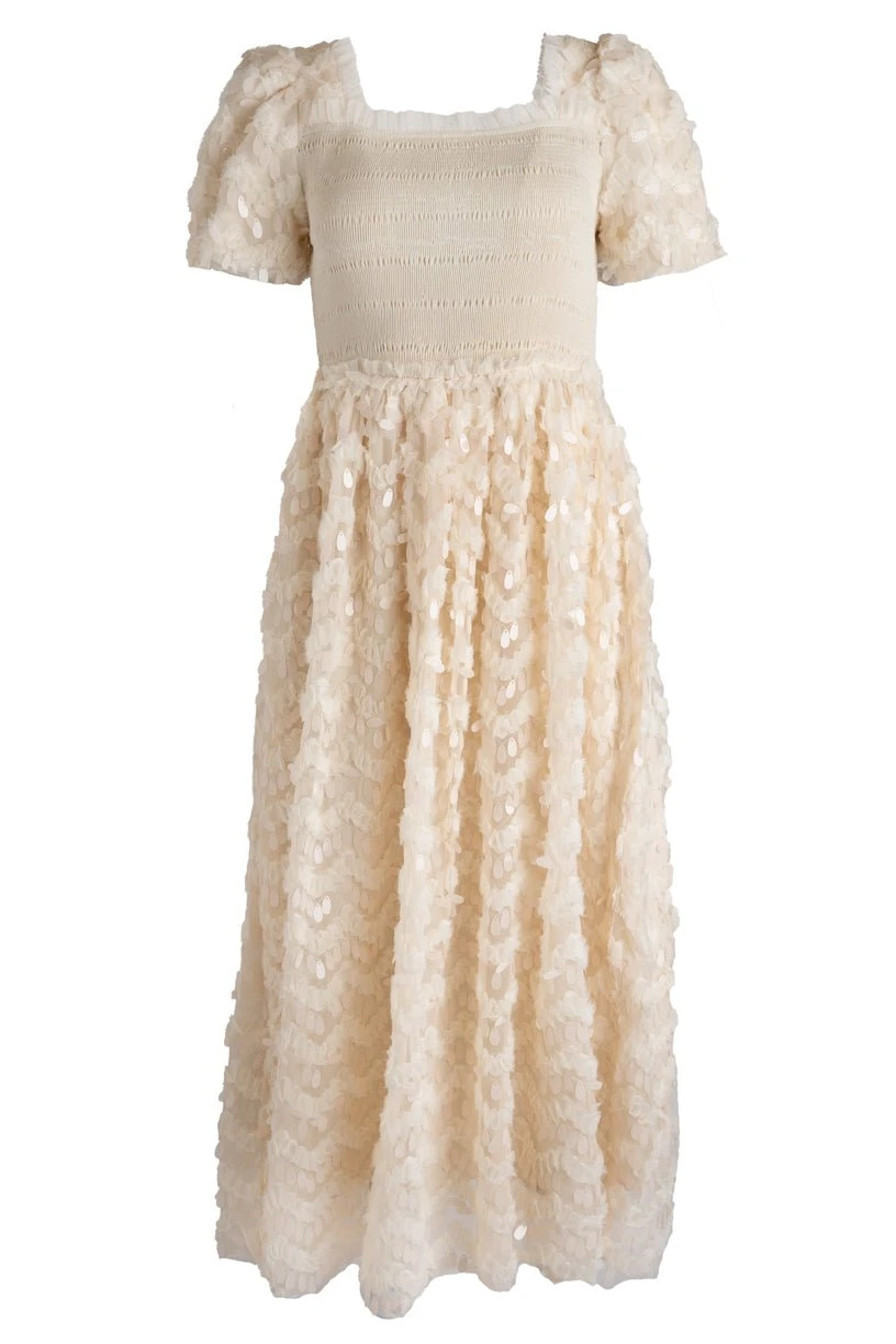 cream sequin smocked midi dress