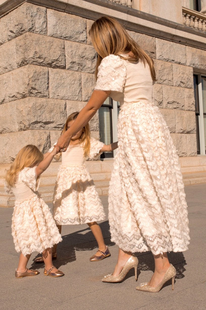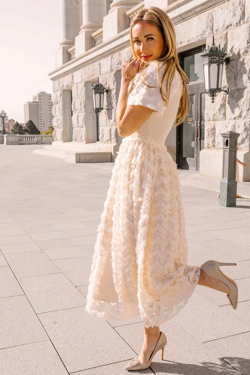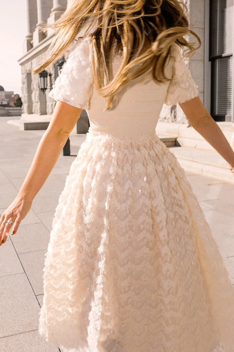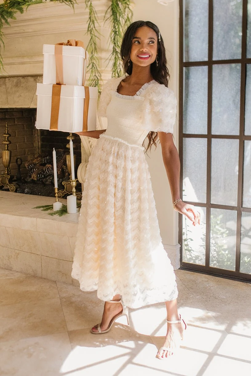 cream sequin smocked midi dress
