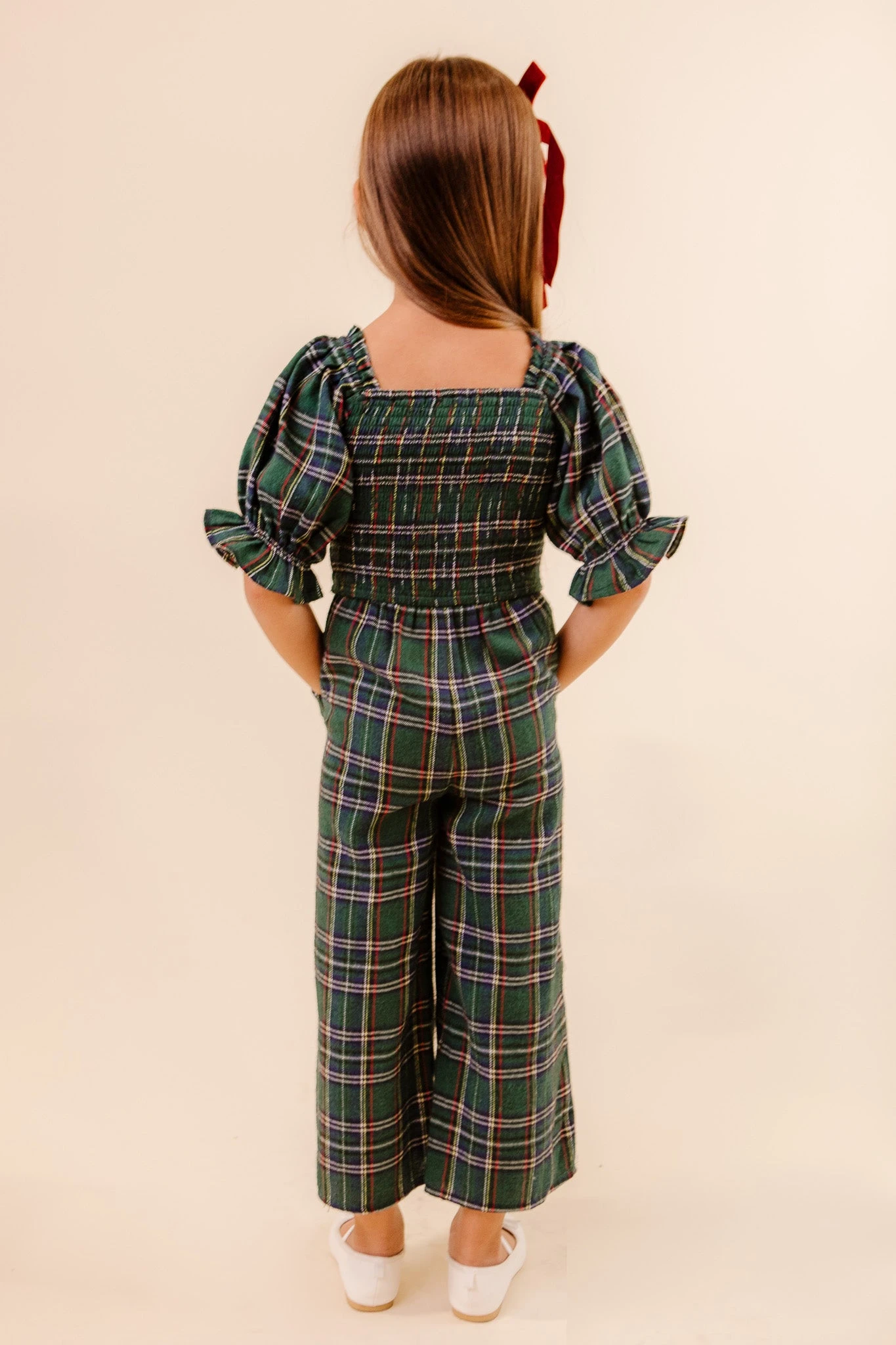 green plaid smocked puff sleeve straight leg jumpsuit