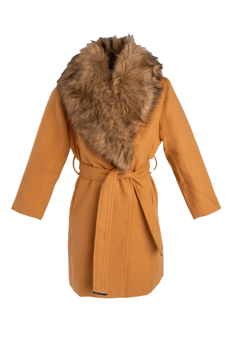camel removable faux fur collar dress coat