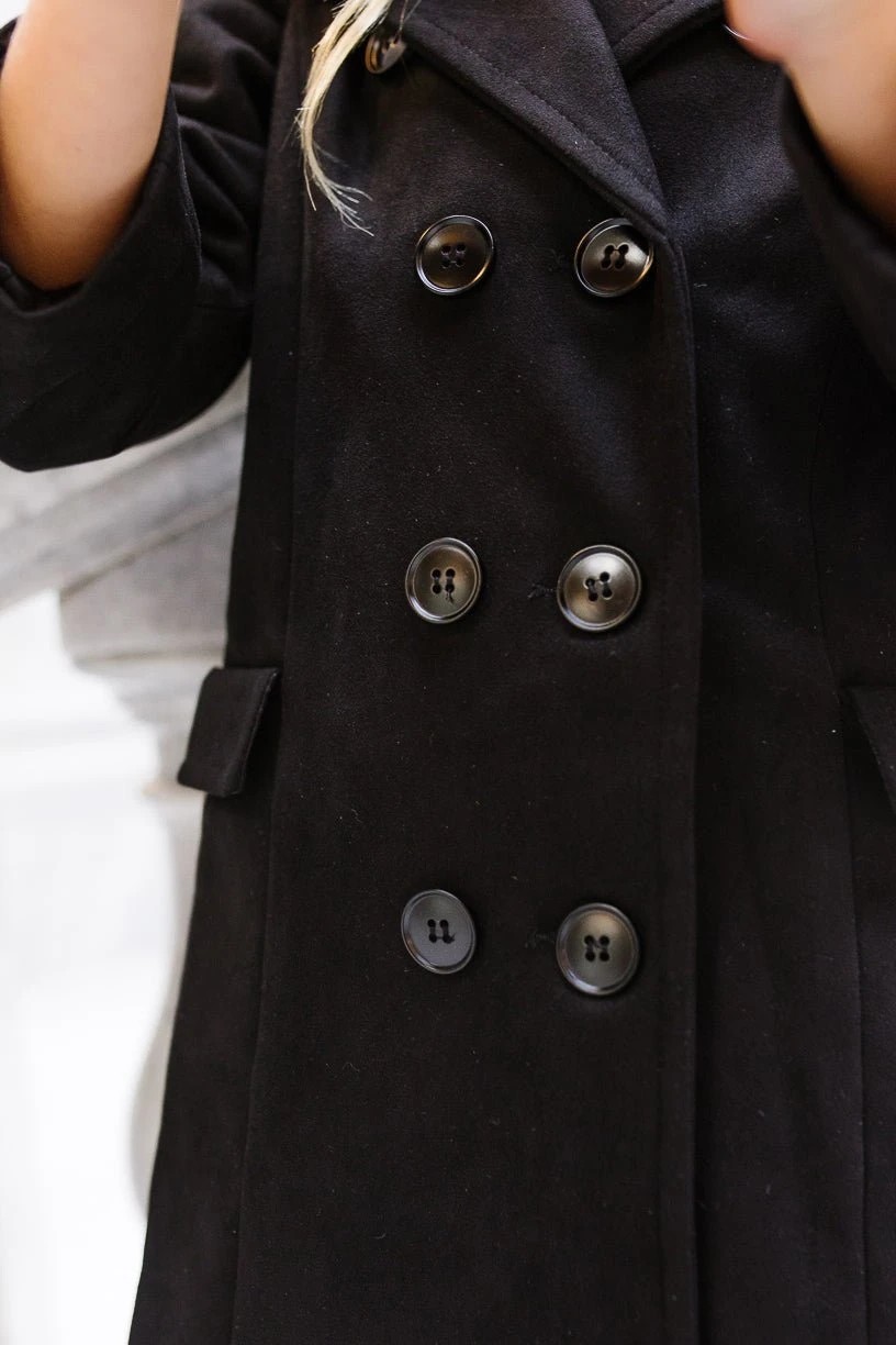 black suede double breasted midi length coat